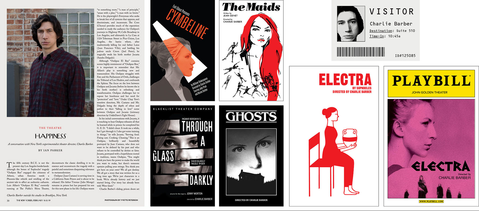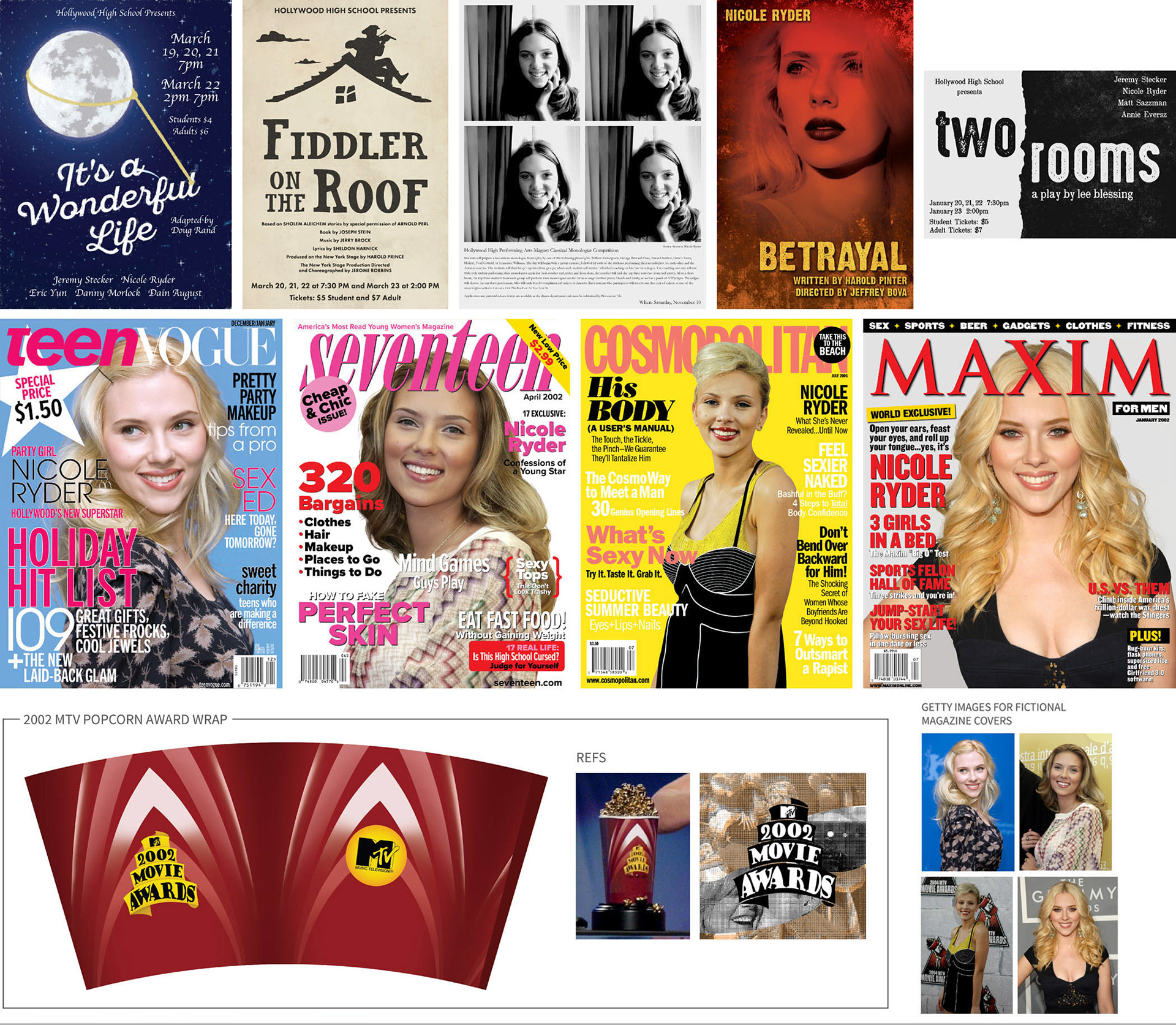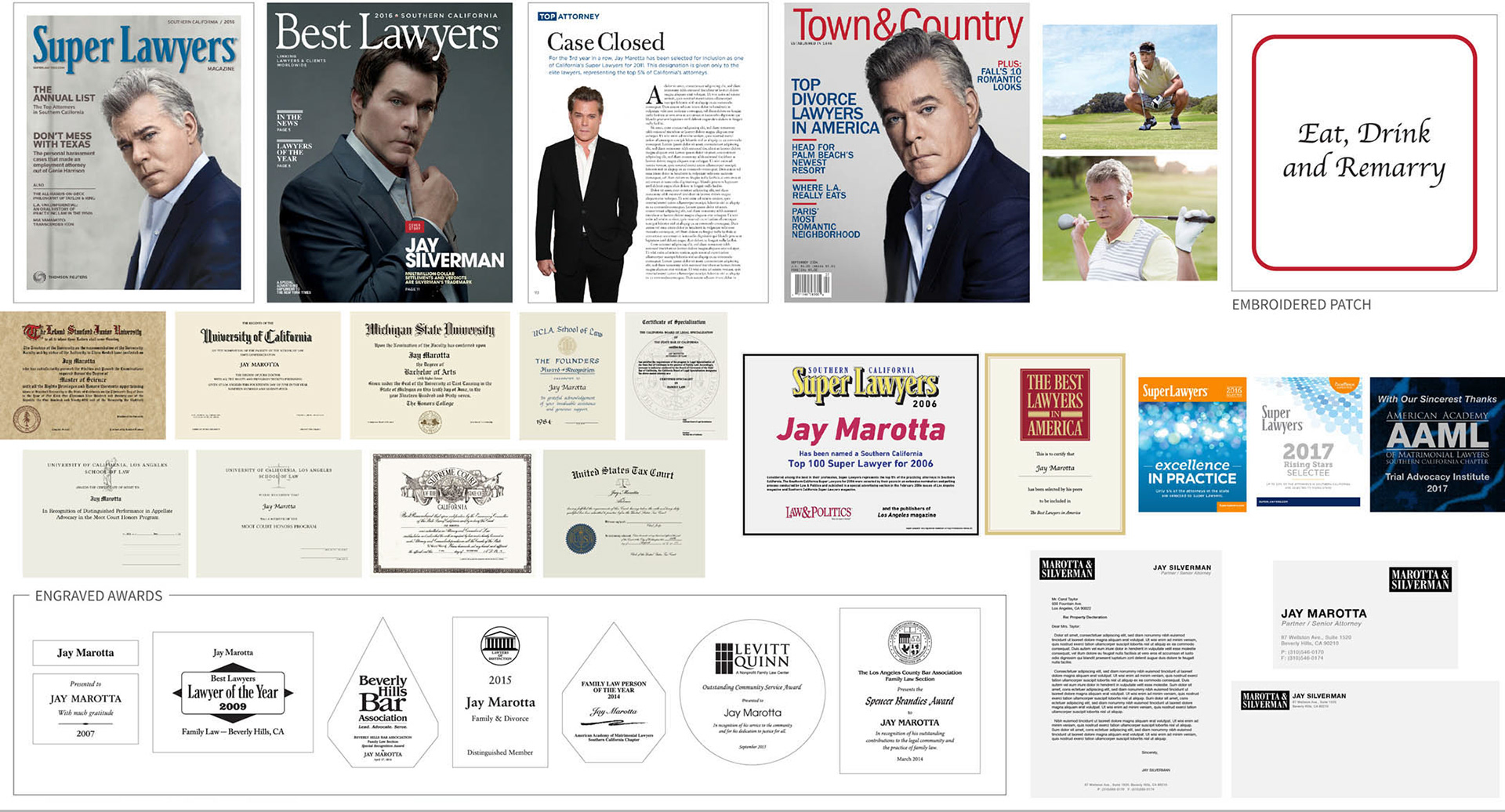 Jay's magazine covers, certificates, awards, and embroidered pillow design.
