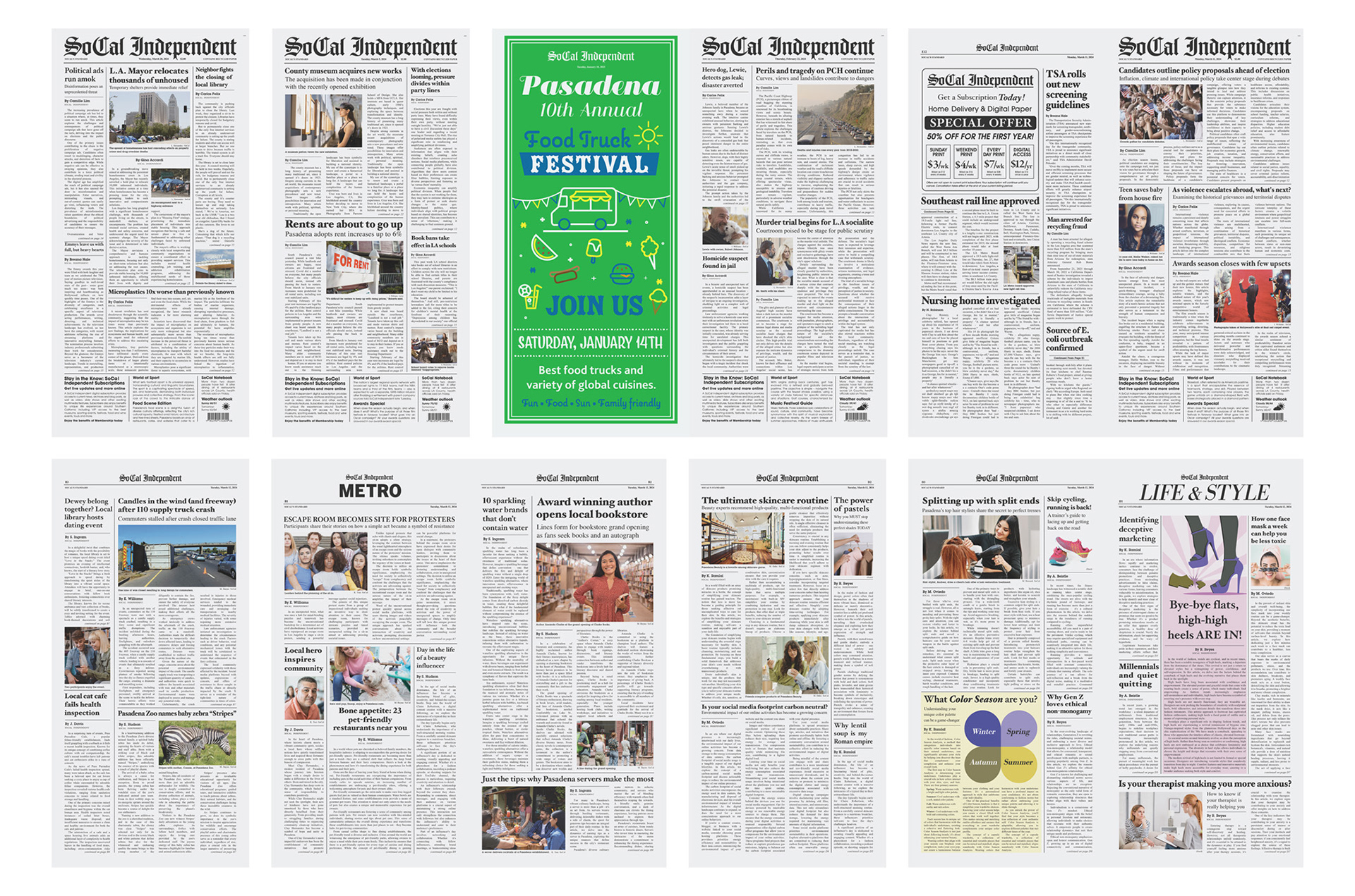 I expanded the newspaper to include additional sections such as Metro and Life & Style, designing layouts that followed the existing typographic hierarchy and grid structure. I also contributed to the editorial presentation by assisting with headline writing and selecting supporting stock photography. In addition to the article layouts, I designed several in-world advertisements, including the Pasadena Food Truck Festival promotion and a SoCal Independent subscription advertisement, helping build out the visual world of the publication.
