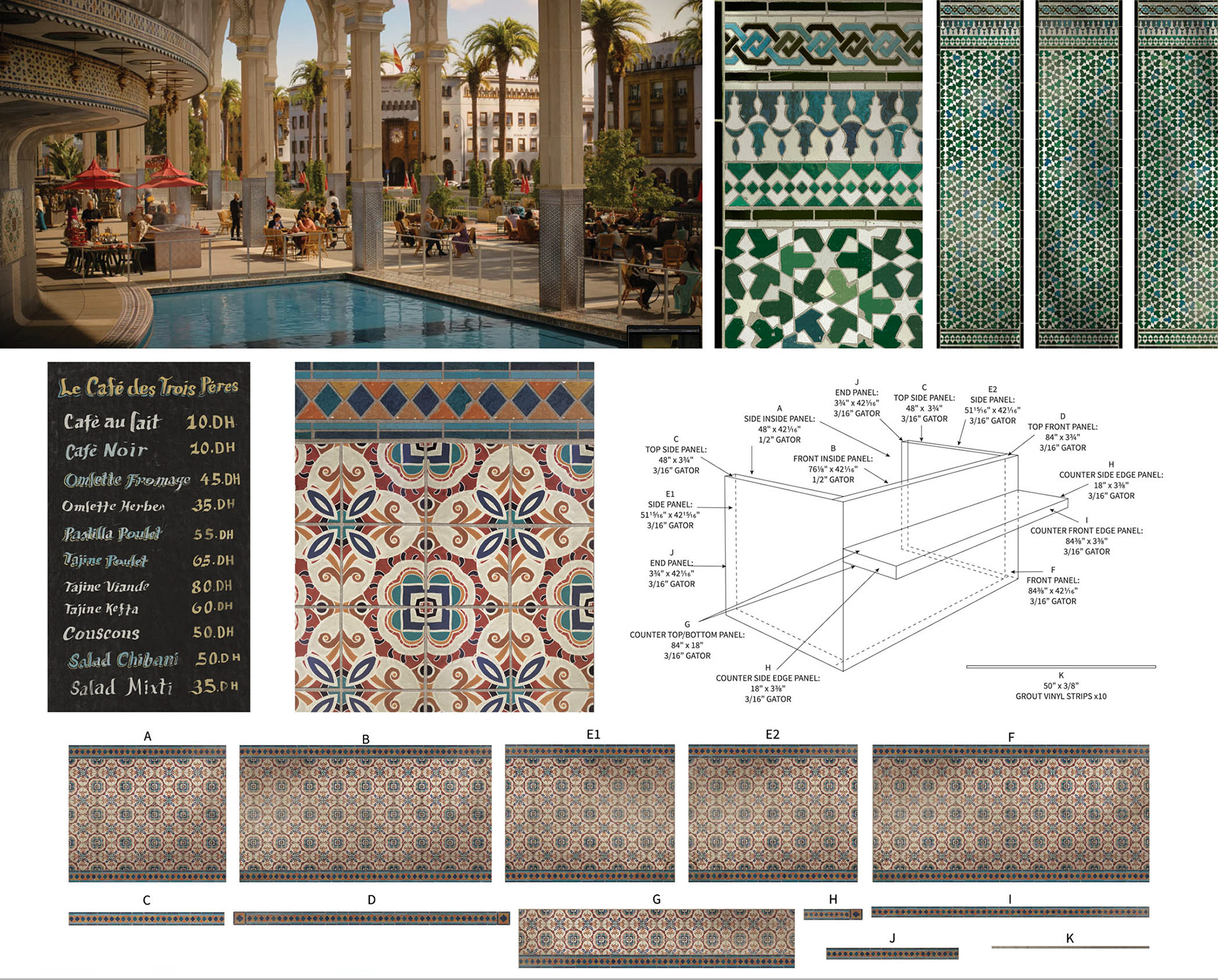 Realistic Moroccan pillar and vendor stall mosaic tile designs. Hand lettering for Moroccan menu.