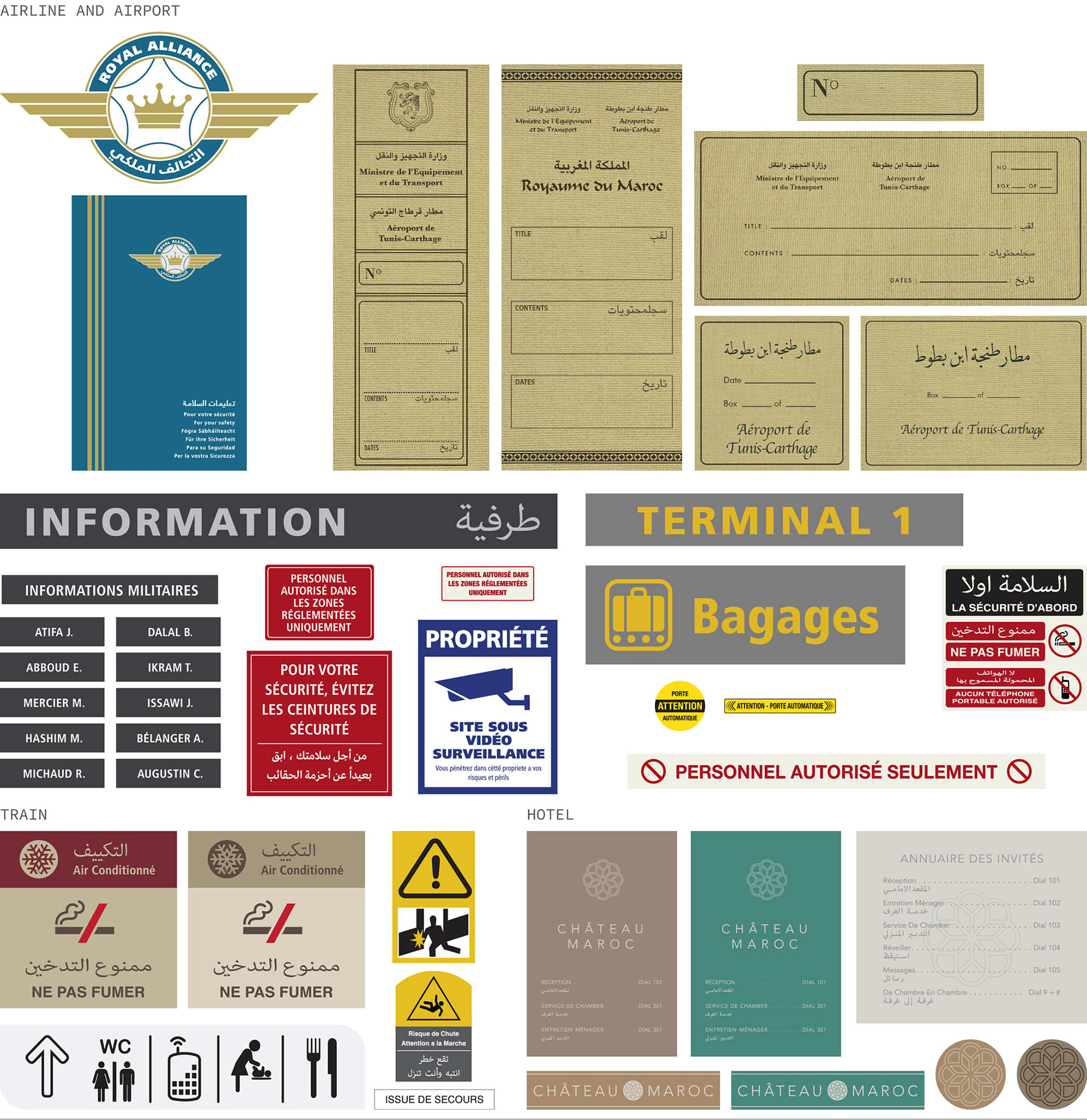 Fictional Moroccan airline, airport, train and hotel designs. Fictional vintage Moroccan record label designs.